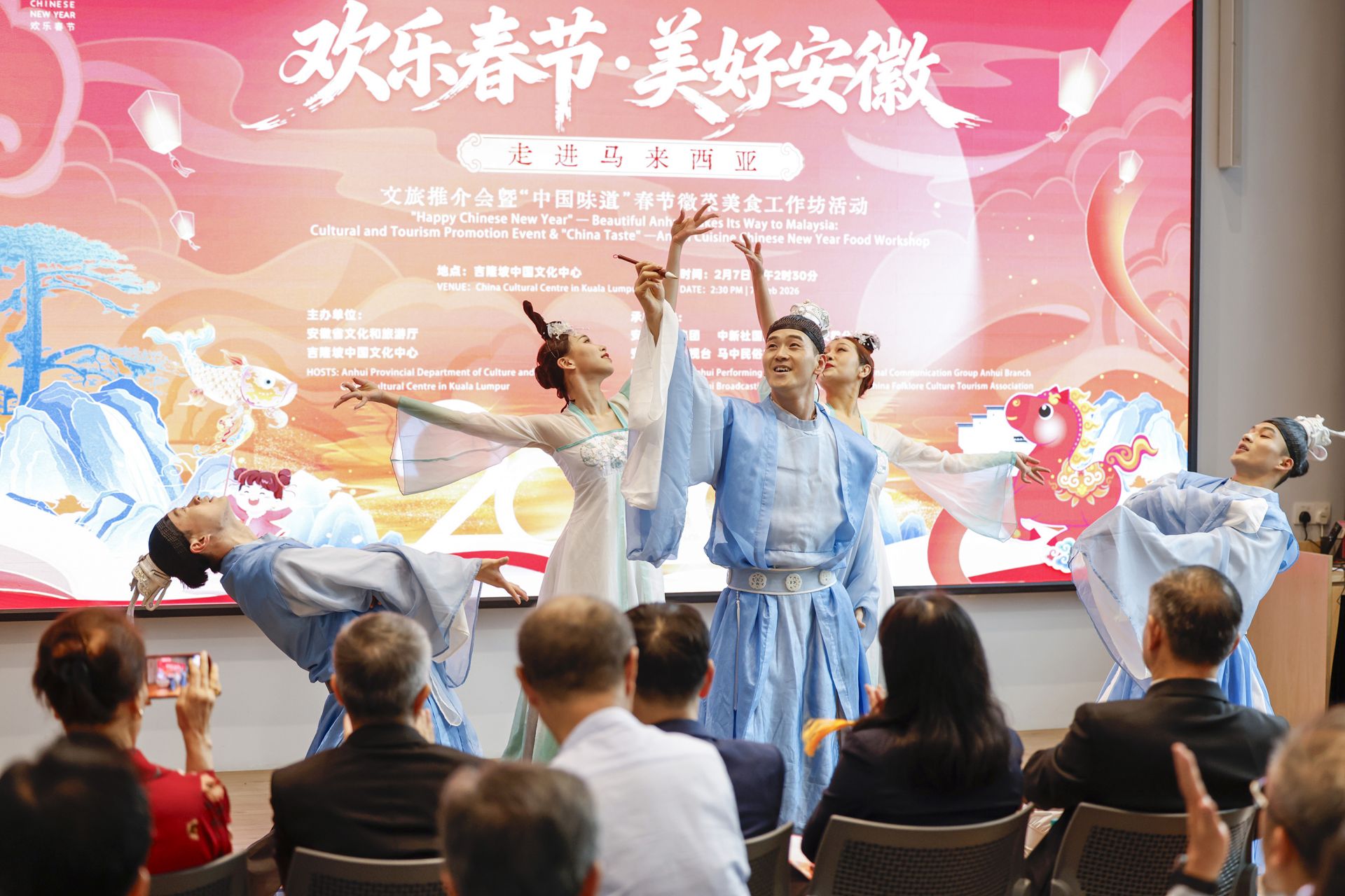 在中华人民共和国驻马来西亚大使馆新春招待会、在吉隆坡中国文化中心、在槟城文旅推介会,演员们克服时间紧张、旅途疲惫等困难,倾情演绎了《让幸福飞起来》《淮水舞韵》《双回门》以及黄梅戏、徽剧经典选段等,赢得全场阵阵掌声。多国嘉宾、海外华侨华人及当地民众齐聚一堂,沉浸式感受到来自江淮大地的文化暖意与新春温情。